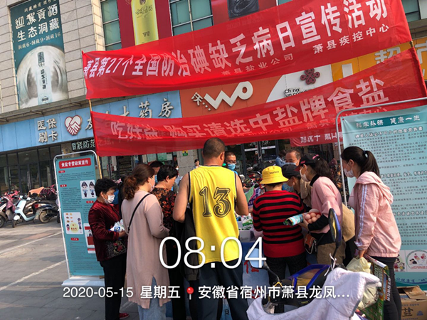5月15日是我国第27个全国碘缺乏病防治日,为保持我省消除碘缺病防治成果,提高大家对碘缺乏病的认识,正确使用碘盐,合肥、蚌埠、宿州、阜阳、马鞍山、淮南、六安、滁州等市盐业公司和多家县盐业公司积极协调当地经信委、市场局、卫健委、疾控中心等政府有关部门,联合开展碘缺乏病防治主题宣传活动。